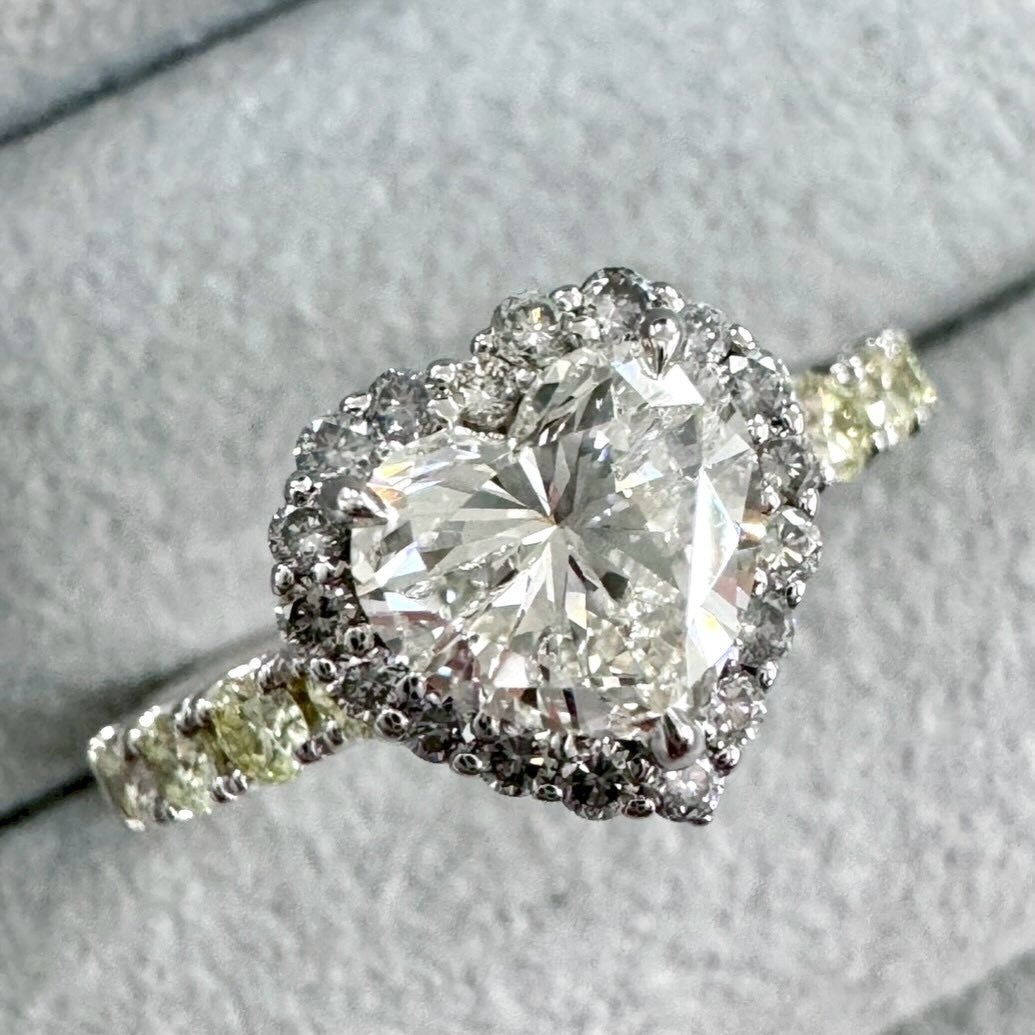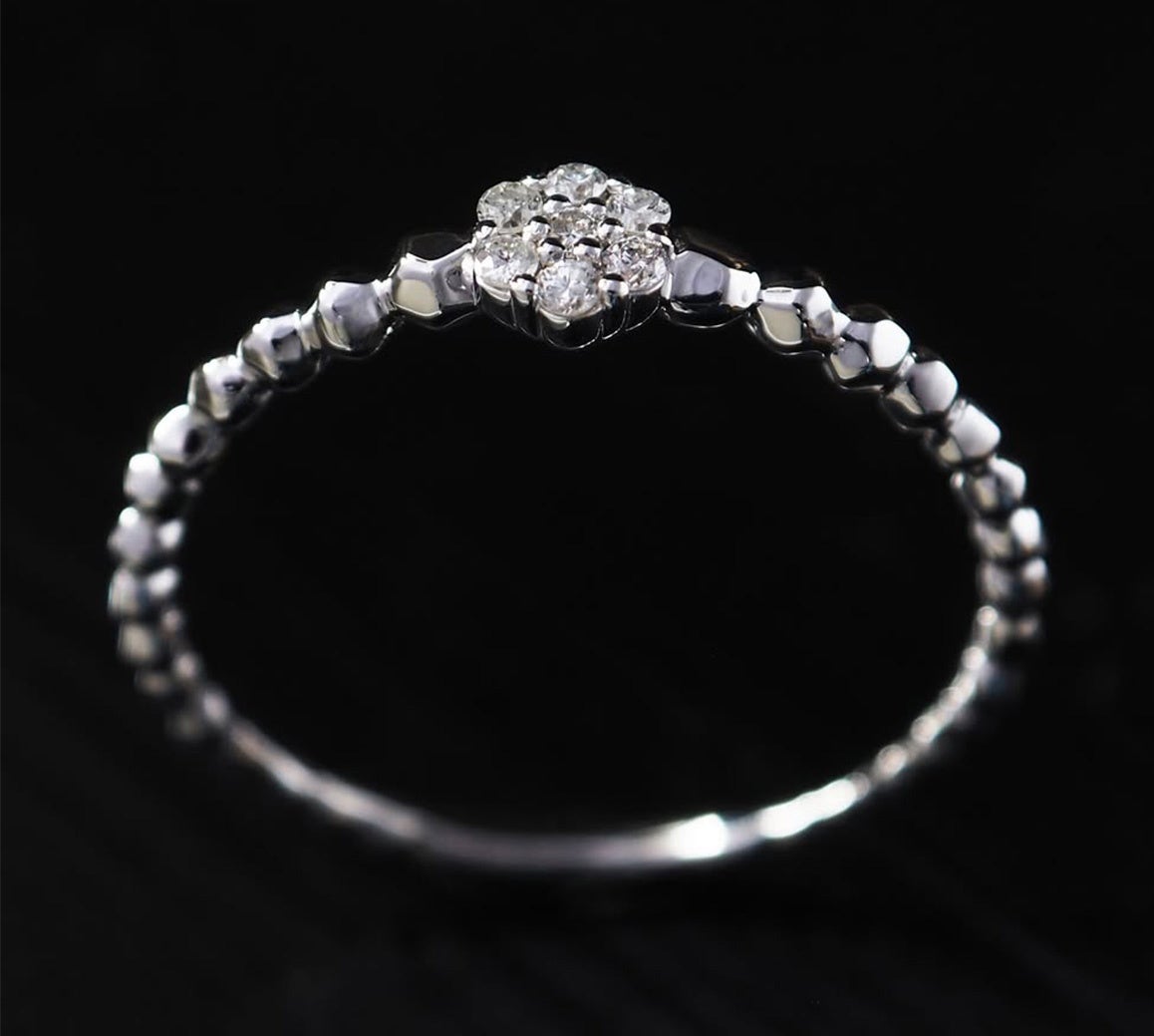春の空気をまとったような色合いを、ほどよい余白をもたせて並べました。向きや角度を揃えすぎず、一粒ごとの個性を活かして仕立てた指環です。
