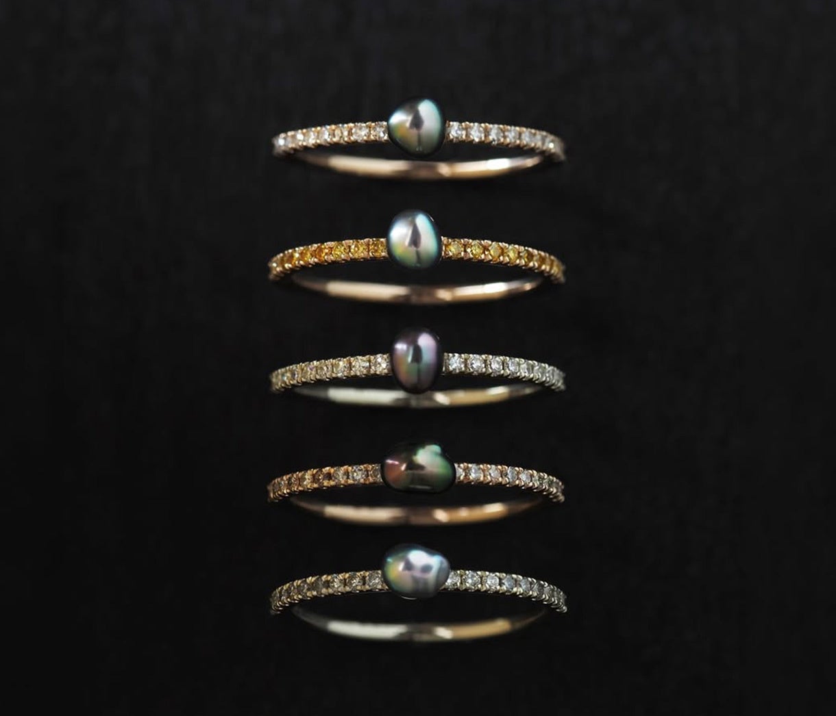 今年の周年では、日頃の感謝を込めて黒蝶真珠を主役とした新作ジュエリーをご用意いたしました。タヒチ・ガンビエ諸島で育まれた黒蝶真珠のケシを用い、リングやピアスなどさまざまなデザインに仕立てております。