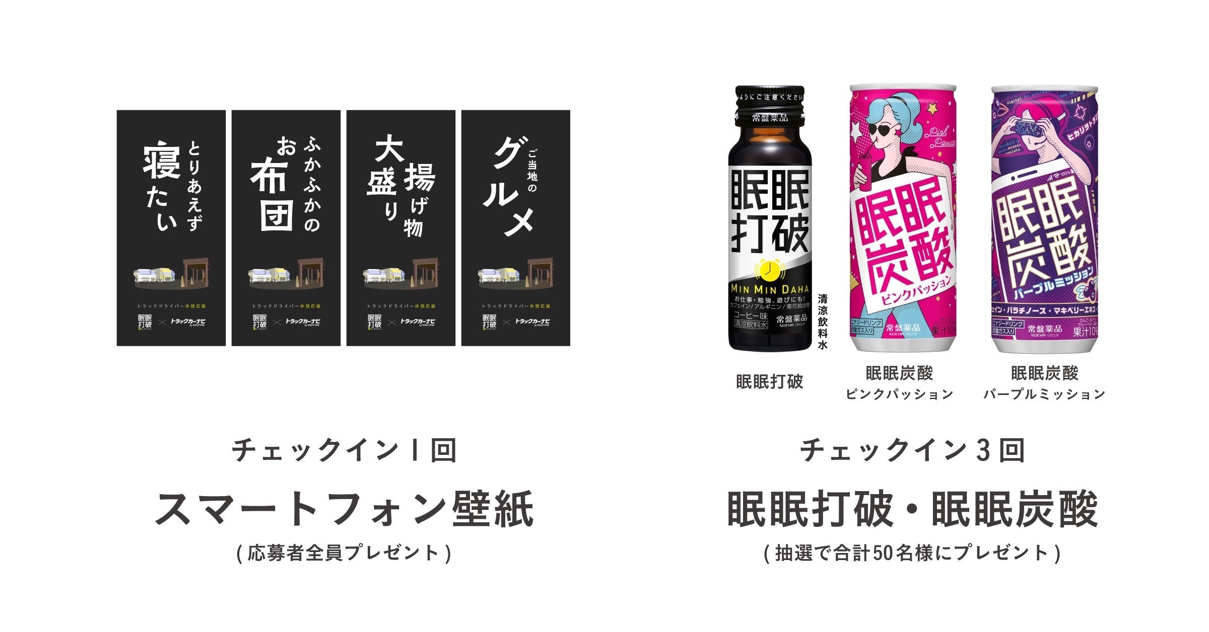 3回チェックインした方の中から、抽選で合計50名様に『眠眠打破』もしくは『眠眠炭酸』をプレゼントいたします。チェックインが1回でも、応募者全員の方に本キャンペーンオリジナルのスマートフォン壁紙をプレゼントいたします。