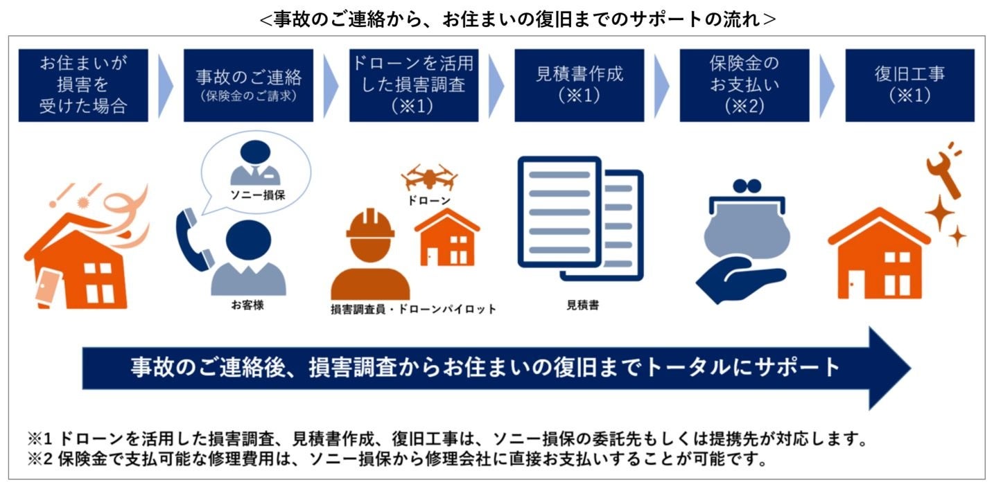 ソニー損保の火災保険、ドローン活用による迅速な損害調査と保険金支払を実現 さらに、修理会社の紹介・手配など、お住まいの復旧までトータルにサポート
