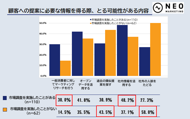 反対に「市場調査を実施したことが無い方」は「市場調査を実施したことがある方」に比べて、「過去の類似提案を探す」において12.6ポイント高く、「社外の人脈をたどる」において22.7ポイント高いという結果でした。
