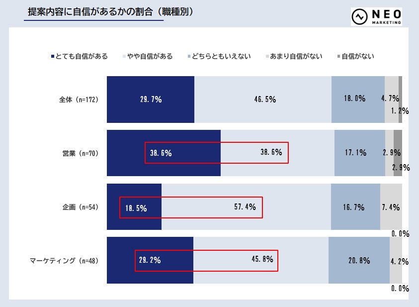 また職種別でも見てみると、営業職はやはり自信のある方が多く、77.2%となりました。しかし、Top2の回答においては、企画職75.9%・マーケティング職75.0%と自信のある割合は大きな差がありませんでした。ただ営業職に比べると割合としては、「やや自信がある」方が多い結果となりました。営業職の方は「とても自信がある」が高いことから自信を持って提案しているようです。