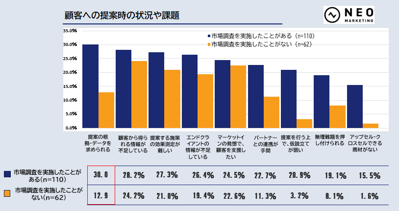 生活者起点のリサーチ&マーケティング支援を行なう株式会社ネオマーケティング(所在地:東京都渋谷区)は2022年6月24日(金)~2022年6月29日(水)の5日間、「マーケティング・コンサル業」「PR・広告代理店業」「その他製作会社など自社事業でクライアント企業の事業支援をしている企業」にて、「営業」「企画」「マーケティング職」の方で普段の業務において「顧客に提案を行うことがある方」を対象に「業務における課題感」等をテーマにインターネットリサーチを実施いたしました。