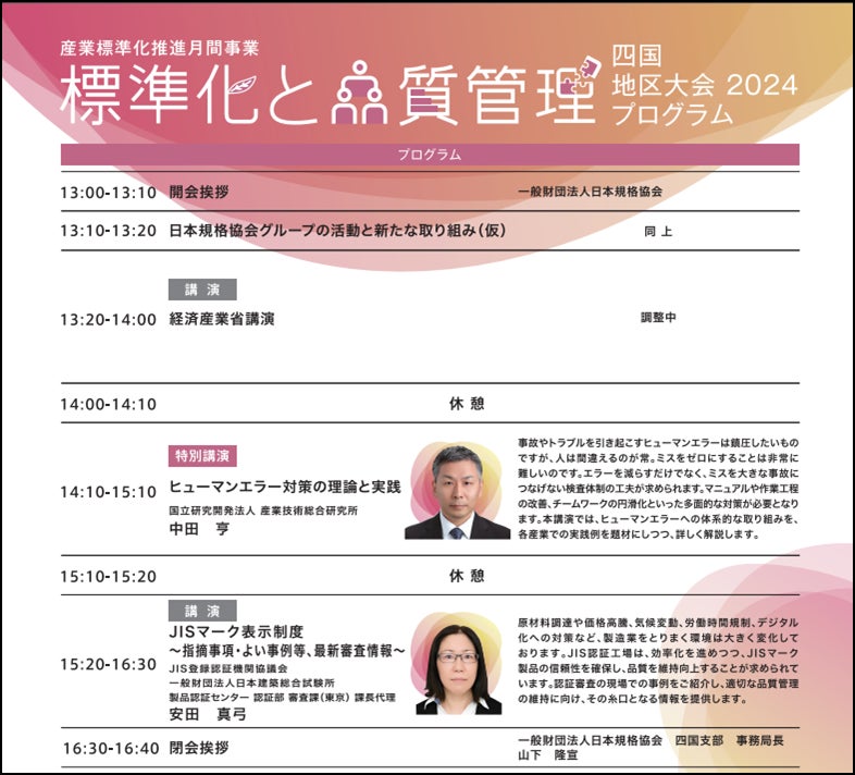 「標準化と品質管理 四国地区大会」はこの普及活動の一環として、経済産業省 四国経済産業局、及び関係団体のご支援のもと、本年度は下記のプログラムにて開催いたします。