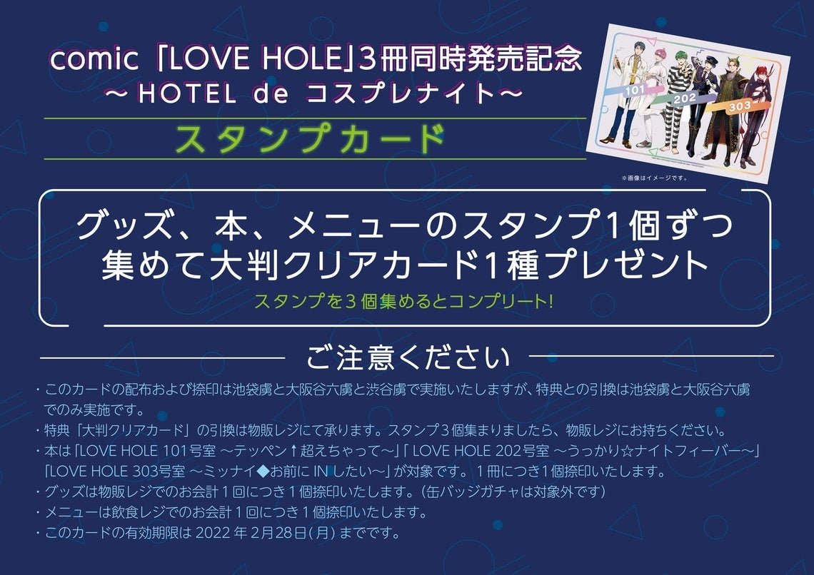 株式会社TORICO(本社:東京都千代田区 代表:安藤拓郎)は、2022年2月1日(火)~2月13日(日)まで東京都豊島区西池袋「池袋虜」にて、2022年2月18日(金)~2月28日(月)まで大阪府中央区谷町6丁目の「大阪谷六虜」にて、comic「LOVE HOLE」3冊同時発売記念~HOTEL de コスプレナイト~を開催いたします。