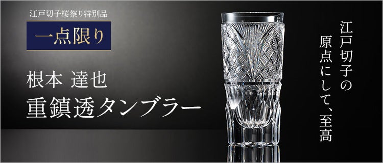 昨年の桜祭りでも即完売を記録した、絶大な人気を誇る江戸切子界のレジェンド・根本達也氏。今作は、今はなきHOYA製の超希少クリスタルを用い、江戸の粋を“透一色”で体現しました。十八番の大胆な曲線カットと伝統文様が織りなす「ごつさと柔らかさ」の黄金バランスは、名匠の系譜を継ぐ氏ならでは。二度と手に入らない素材と卓越した技が融合した、圧倒的な透明度を誇る逸品です。