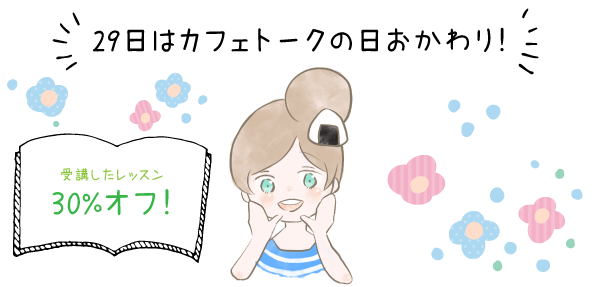 日本最大級オンライン習い事サイト「カフェトーク」が毎月19日と29日に実施している30%ポイントバックキャンペーンです。