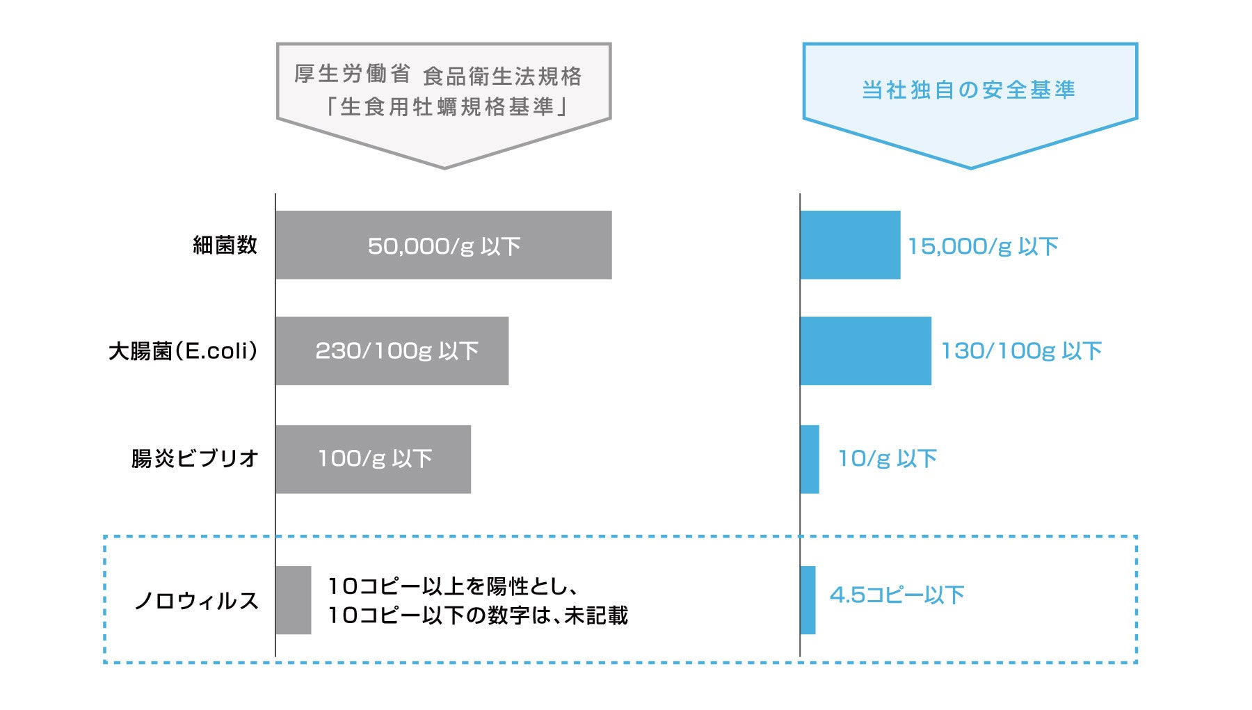 当社では、食品衛生法に定められた基準よりも厳しい自社基準に従った検査体制を確立し、年間3,000検体以上のノロウイルス検査を実施するなど、牡蠣のリスクを限りなく低減することに取り組み、ノロウイルスが検出されないロットのみを流通しています※2。