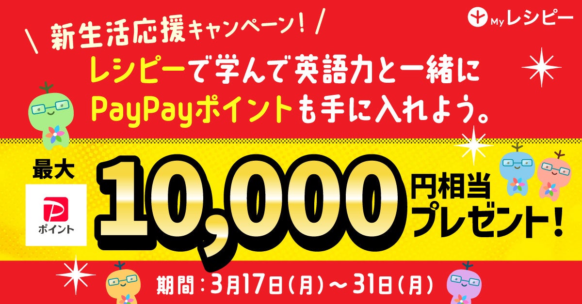 株式会社ポリグロッツ(本社:東京都新宿区、代表取締役:山口隼也)は、英語学習アプリ「レシピー」において、新生活応援キャンペーンを実施しています。本キャンペーンでは、期間中に「Myレシピ」を利用して5日間連続で学習を達成した方に抽選で「PayPayポイント」をプレゼントいたします。