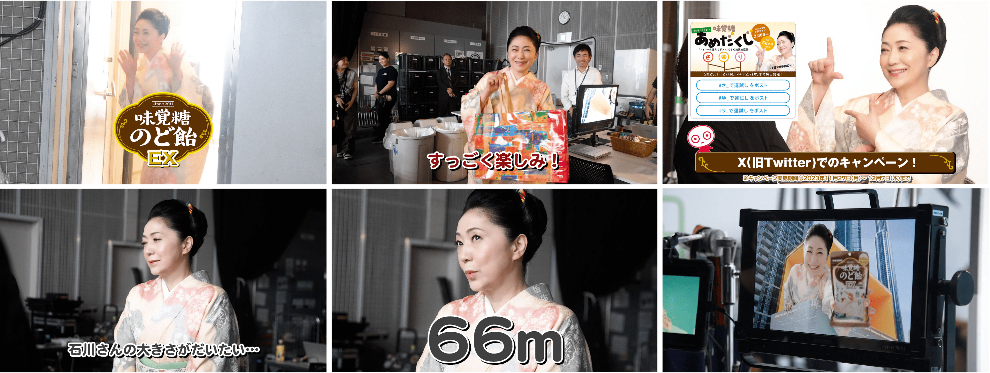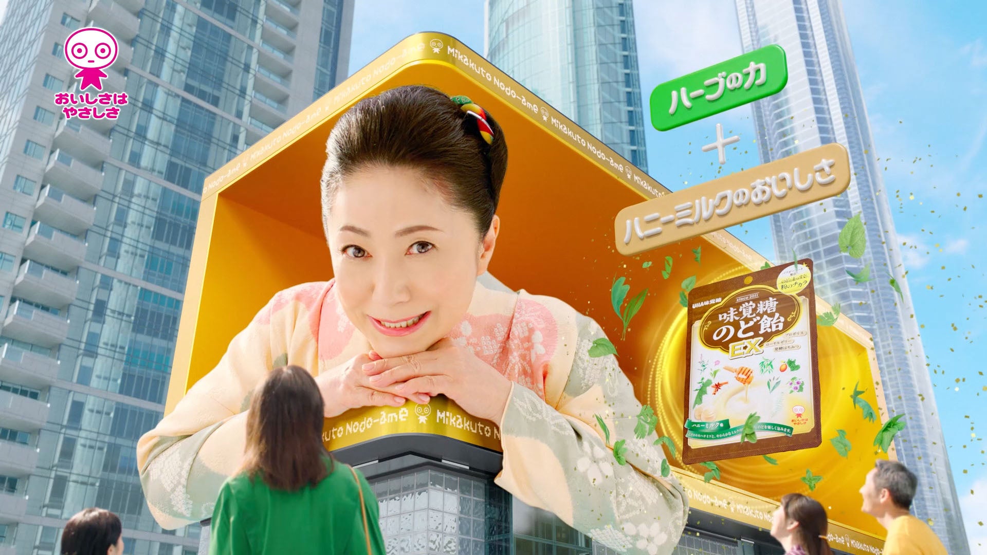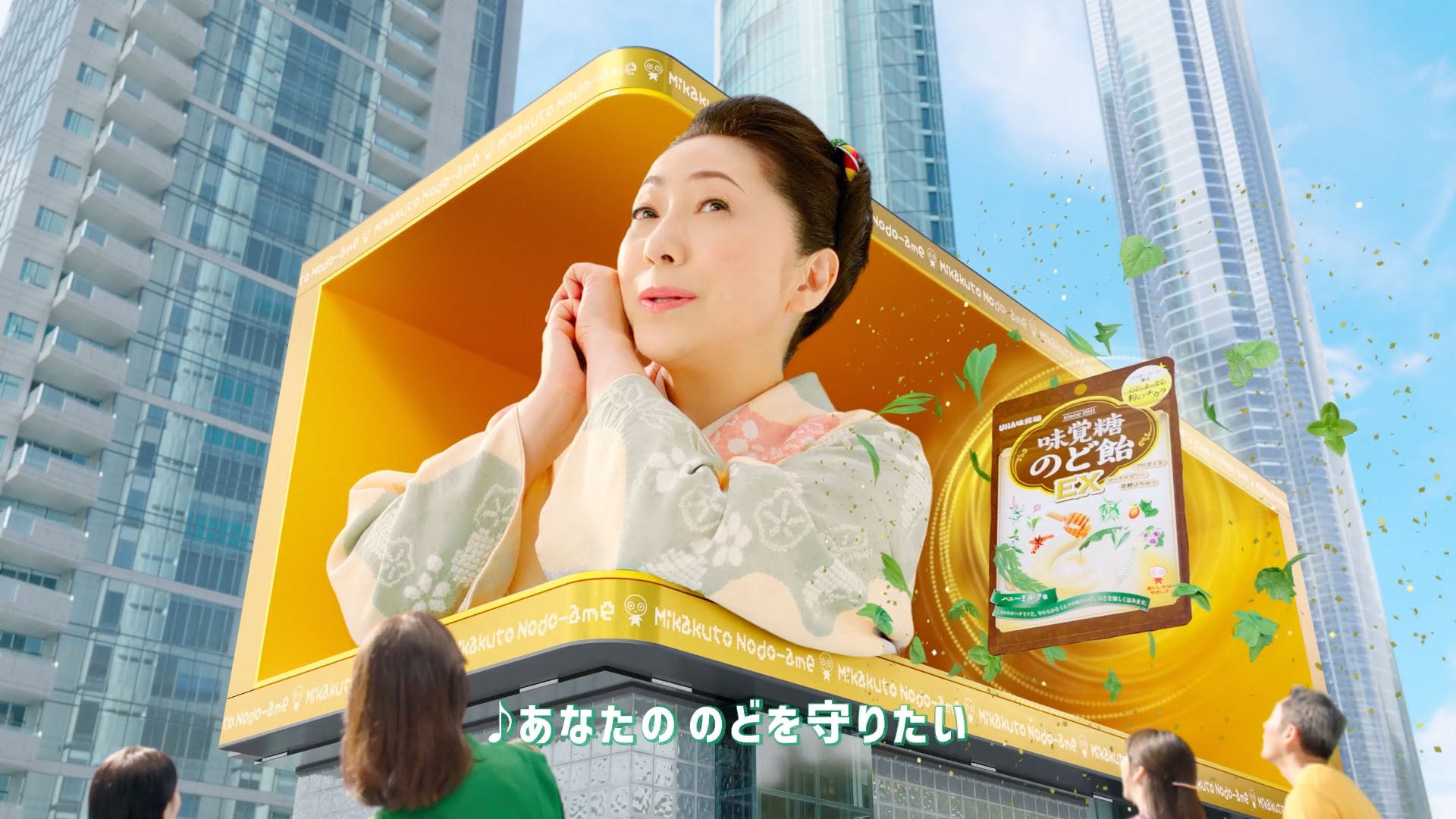 味覚糖のど飴󠄀は、パウダーコート製法によりハーブのチカラがのどにまっすぐ届く本格のど飴󠄀。乾燥などが気になる季節に、みなさんののどを守っていきたいということで、石川さゆりさんが3D街頭ビジョンに現れるというCMを制作。街ゆく人たちに歌を届けながら、さゆりイチ推しの味覚糖のど飴󠄀をアピールするという内容になっています。身長がおよそ43倍の約66mに巨大化したさゆりさんにご注目ください!