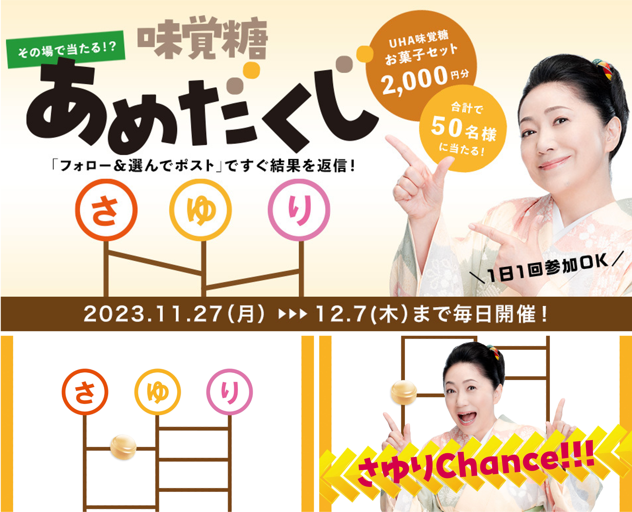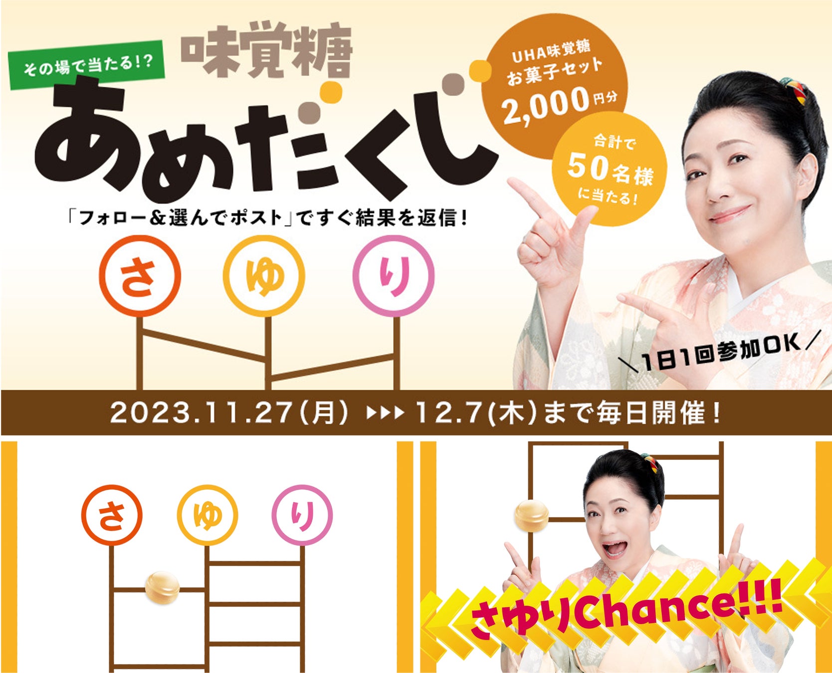 X(旧Twitter)にてUHA味覚糖公式アカウント(@UMikakuto)をフォローし、「味覚糖あめだくじ」の投稿から「#さ/ゆ/り_で運試しをポスト」のいずれかを選び、ポスト。
