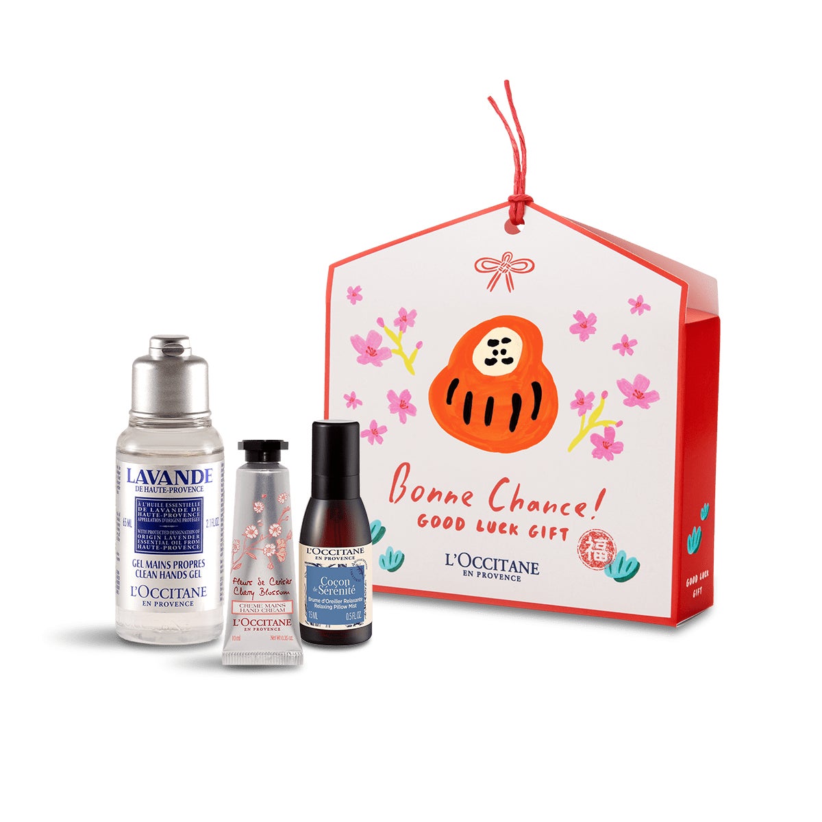 絵馬のデザインのパッケージがかわいい「グッドラックギフト」は、頑張る人を応援する3つの製品が入った特別な限定キット。「桜が咲きますように」と成功を祈る気持ちが伝わるさくらの香りの「チェリーブロッサム ソフトハンドクリーム」、プレッシャーに押しつぶされそうな時にぴったりな、気持ちが落ち着くラベンダーの香りで手肌を清潔に保つ*「ラベンダー クリーンハンドジェル」、不安な夜にシュっと一吹きすれば、癒しの香りが眠りに寄り添う「プロヴァンスアロマ ピローミスト(リラクシング)」の3点セットです。受験や試験、就活、転職、恋愛に頑張っているなど、あなたが応援したい方へ香りのギフトを、この年末年始の時期に贈りませんか?