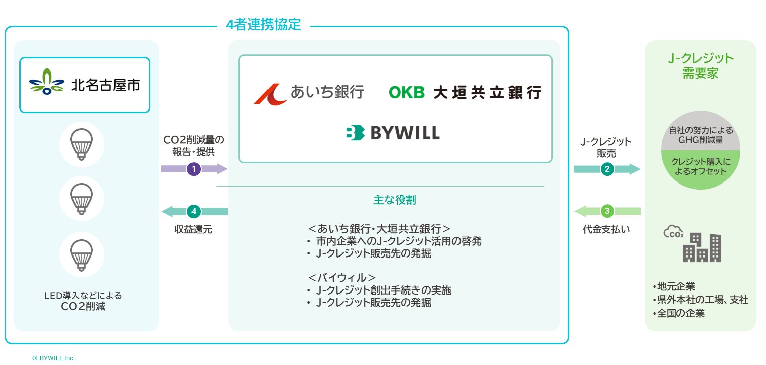 日本全国47都道府県のカーボンニュートラル実現を目指す株式会社バイウィル(本社:東京都中央区、代表取締役社長:下村 雄一郎、以下「バイウィル」)は、愛知県北名古屋市(市長:太田 考則)、株式会社あいち銀行(本店:愛知県名古屋市、代表取締役頭取:鈴木 武裕、以下「あいち銀行」)、株式会社大垣共立銀行(本店:岐阜県大垣市、取締役頭取:林 敬治、以下「大垣共立銀行」)と「J-クレジットを起点とした環境価値に関する連携協定」を締結しました。