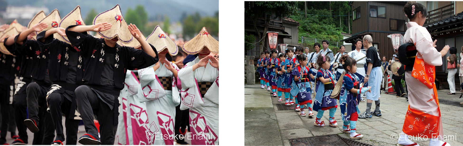 榎並悦子氏は1996年に初めて「おわら風の盆」を撮影。その優雅な踊りと、おわらの響きに満ちた独特の空間に魅せられ、以来20年以上にわたって通いつめて、風の盆の撮影を続けてきました。会場に流れる「おわら」の調べとともに、写真が奏でる「おわら風の盆」をお楽しみください。