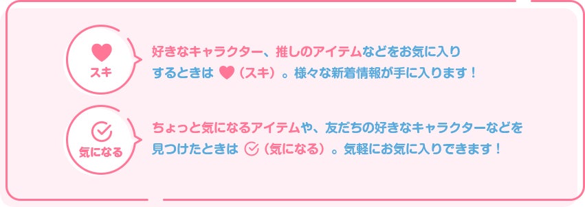 作品タイトルやアーティストを❤️(スキ)で「お気に入り」すると「新着アイテム情報」が、プライズアイテムを❤️(スキ)で「お気に入り」すると「取扱店舗情報」が確認できます。