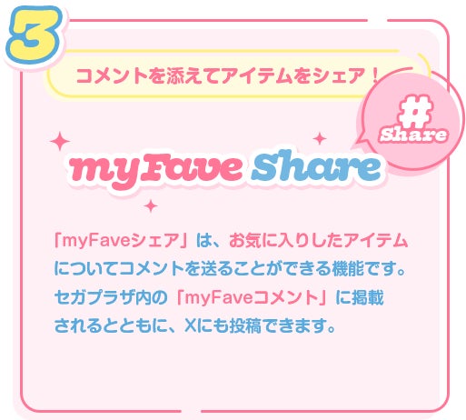 現在、様々なエンタテインメントのシーンにおいて、人と人とのデジタルとリアルを跨いだコミュニティ自体が、“推し活”という言葉に代表されるような日本を象徴するポップカルチャーとして独自の発展を遂げています。そこでセガプラザでは、“お気に入り(Fave)”の作品やキャラクター、アーティストなどのアイテム情報をまとめてチェックできる機能を導入いたします。また、自身で楽しむだけではなく、同じ“お気に入り(Fave)”を持つコミュニティに向けて共有しやすいシェア機能なども拡充いたします。