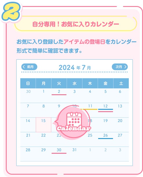 お気に入り登録したアイテムの登場・発売日をカレンダー形式で確認できます。