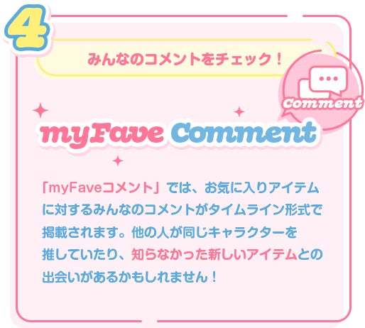 お好きな作品タイトルに関連する新着アイテムの情報が表示される「新着アイテム情報」や、お気に入り登録したアイテムをカレンダー形式で表示する「お気に入りカレンダー」機能を追加しました。いままで以上に利便性を向上し、ユーザーひとりひとりに合わせた情報を提供することが可能になります。さらに、発信の場となる「myFaveシェア/ myFaveコメント」やお気に入り数に応じた「myFaveランキング」などにより情報発信や話題を提供することでファン同士のコミュニティをサポートいたします。