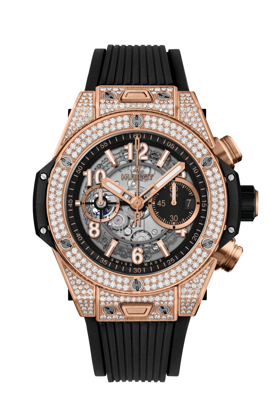 「ビッグ・バン ウニコ キングゴールド パヴェ」は、162個のダイヤモンドがセットされたケースと、123個のダイヤモンドがセットされたベゼルが特徴のタイムピースです。