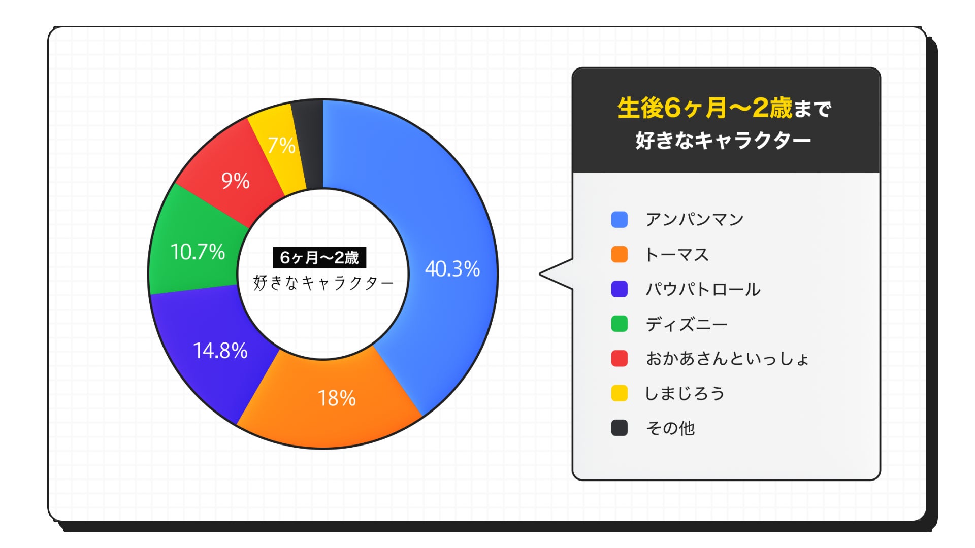 ・生後6か月~2歳までを対象に「もっとも好きなキャラクター」を調査した結果、アンパンマンと回答した人が40.3%で、1位という結果に。