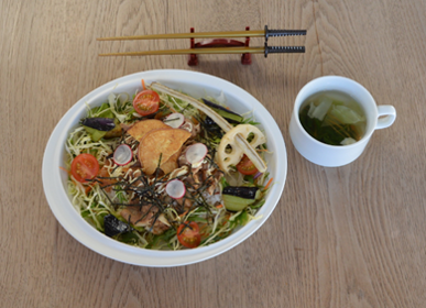 佐賀海苔のドレッシングや、ゴボウと蓮根で作った食べる「刀」をトッピング。