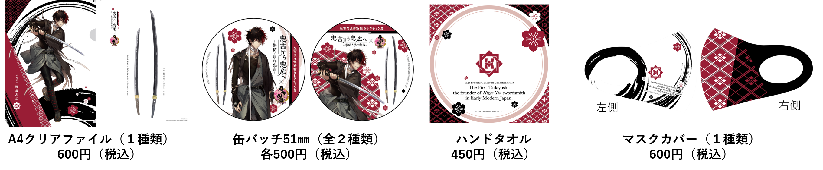 初代肥前忠吉の刀及び脇差とともに、佐賀県の伝統工芸品である「佐賀錦」の柄と佐賀県木の「クスノキ」の花をあしらった特別グッズです。ぜひ、来場記念に展覧会会場内の物販ブースにてお買い求めください。(展覧会会期中の販売となります。)