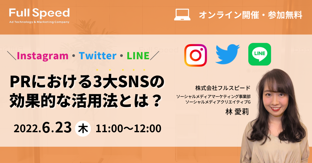 SNSをはじめとするインターネットマーケティング支援を行う株式会社フルスピードは、「Instagram・Twitter・LINE PRにおける3大SNSの効果的な活用法とは?」と題した無料オンラインセミナーを2022年6月23日(木)11時より開催いたします。