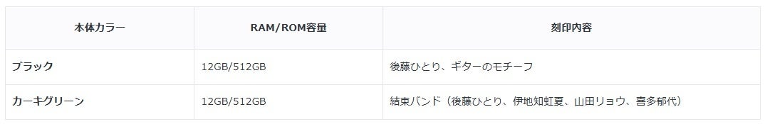 本体カラーのブラックは、背面パネルに後藤ひとりとギターのモチーフを刻印します。カーキグリーンの背面パネルには、4人のキャラクターが揃ったオリジナルデザインを刻印します。本体カラーと刻印デザインの組み合わせは固定です。