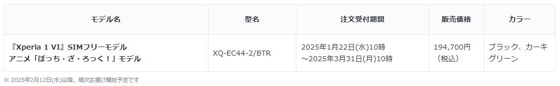 ソニーマーケティング株式会社は、アニメ「ぼっち・ざ・ろっく!」第4弾のコラボレーションモデルとして、限定デザインのスマートフォン『Xperia 1 VI』SIMフリーモデルの注文受付を本日1月22日(水)から開始します。