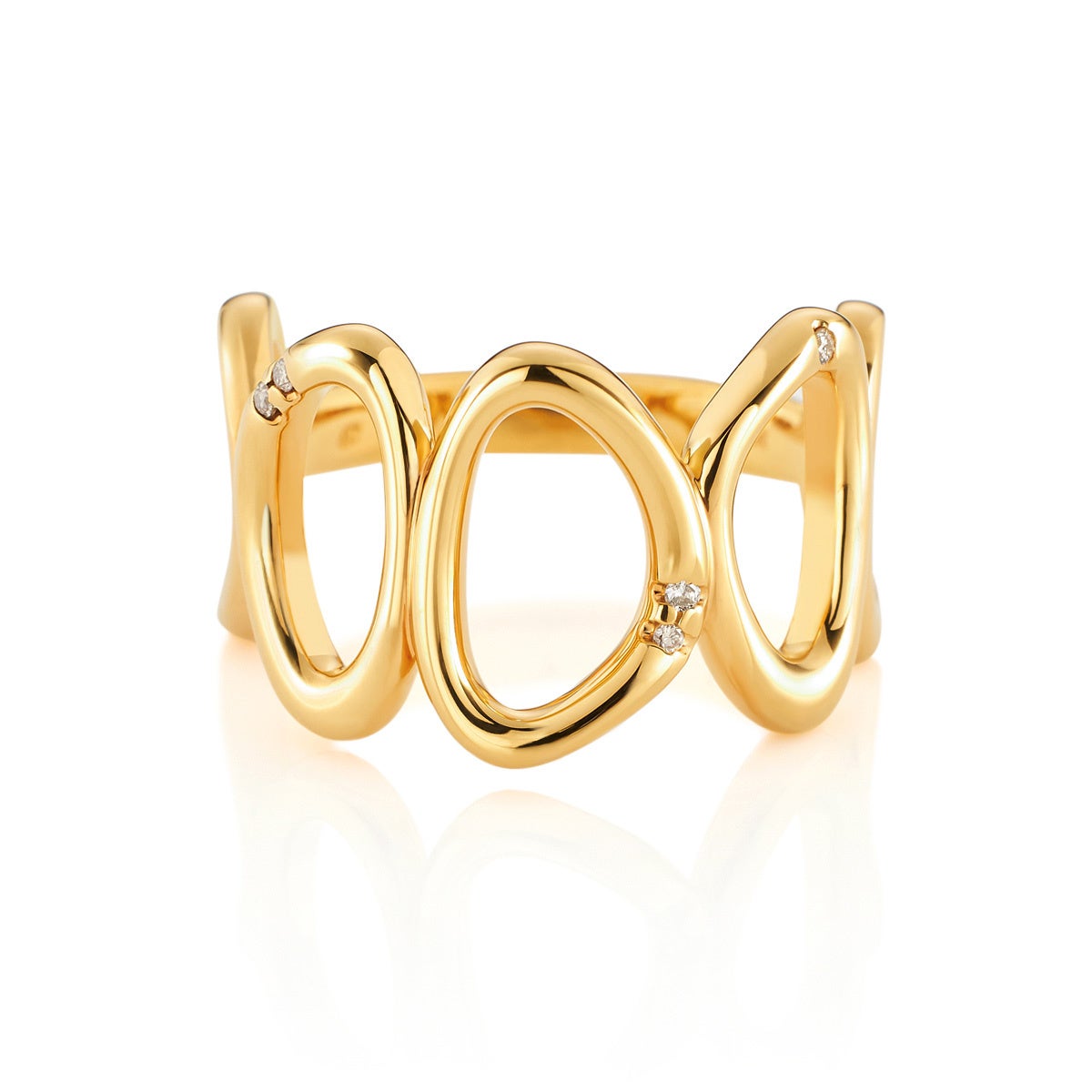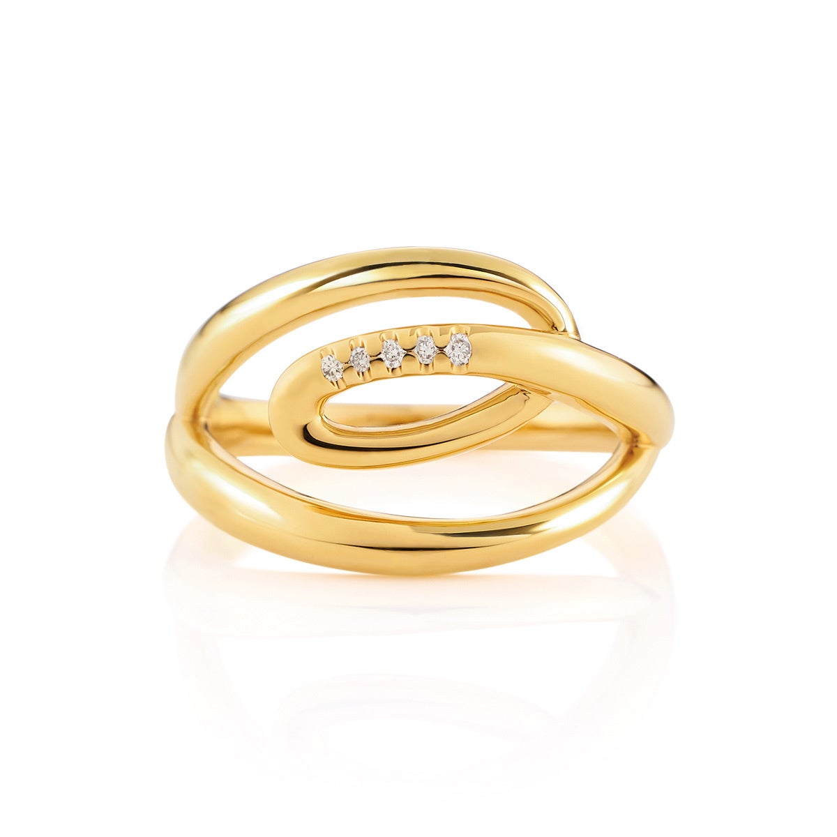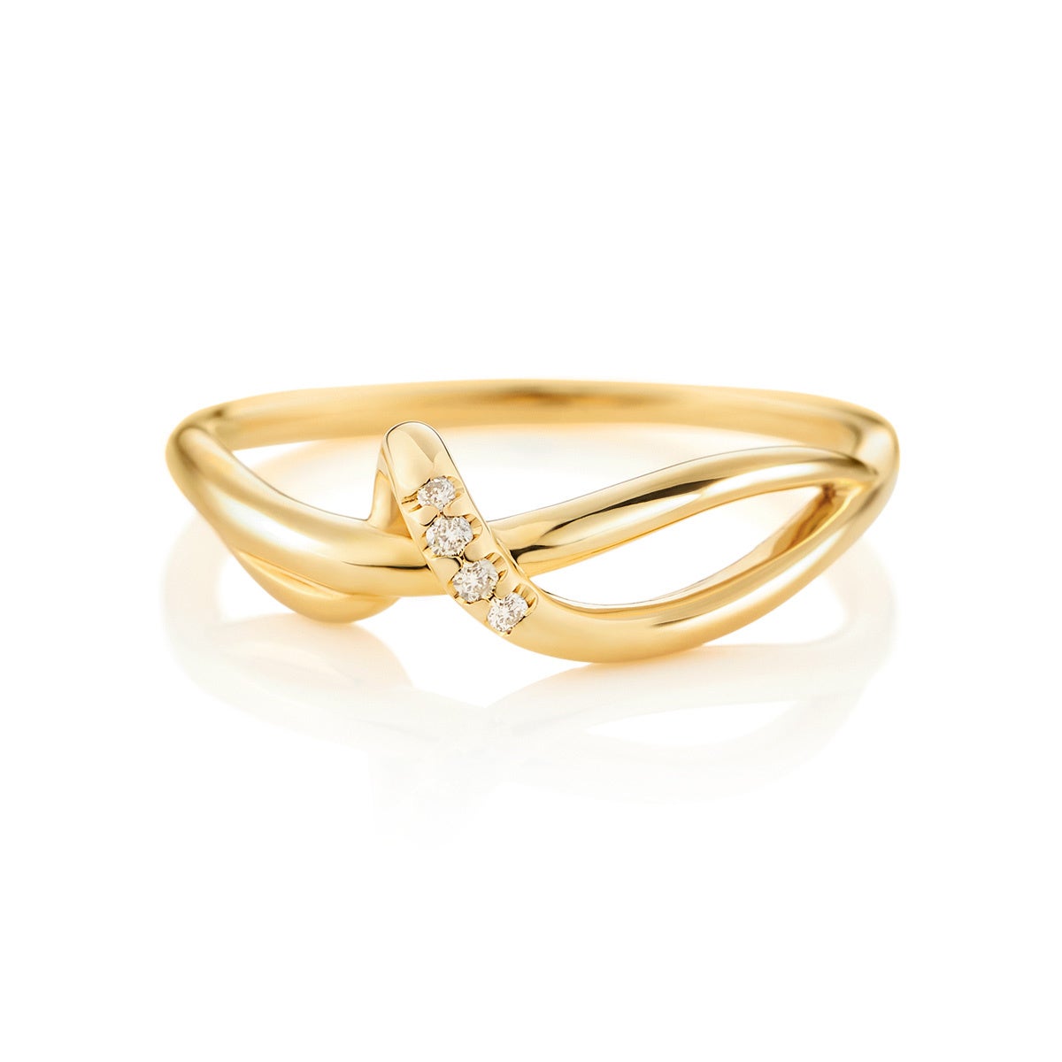 リズミカルに流れるしなやかな水の動きを、くるくるとした立体感のあるラインや渦を巻くような曲線で表現したイヤーアイテムも。一粒のダイヤモンドが上品にきらめくイヤーカフやフープピアス、さらにチェーンが動くたびに煌めくピアスなど、身に着ける人の動きに合わせて繊細な輝きを放つモダンなアイテムが揃います。豊かな曲線美にダイヤモンドを散りばめたリングも登場。上質なデザインでありながら、他にない特徴的な地金のラインがコーディネートにアクセントを添え、ワンランク上の印象へと導きます。