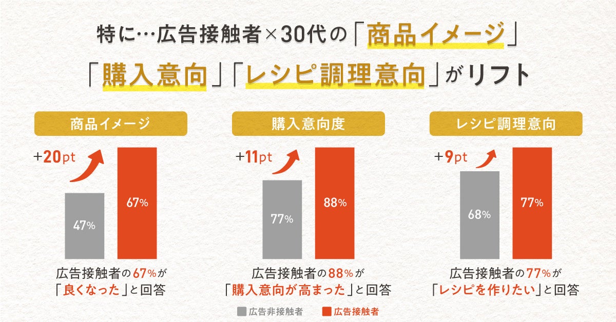 施策後にブランドリフト調査を行い、「商品認知」「購入意向」「商品イメージ」「レシピ調理意向」など、多くの調査項目で広告接触者群でリフトする結果となった。