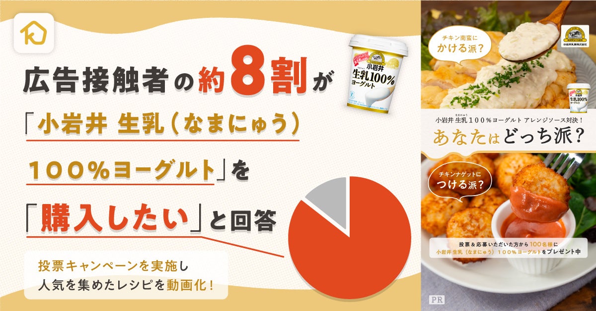 「クラシル」がユーザー投票型キャンペーンで、小岩井乳業「小岩井 生乳(なまにゅう)100%ヨーグルト」のプロモーションを実施し、広告接触者の約8割が「購入したい」と回答