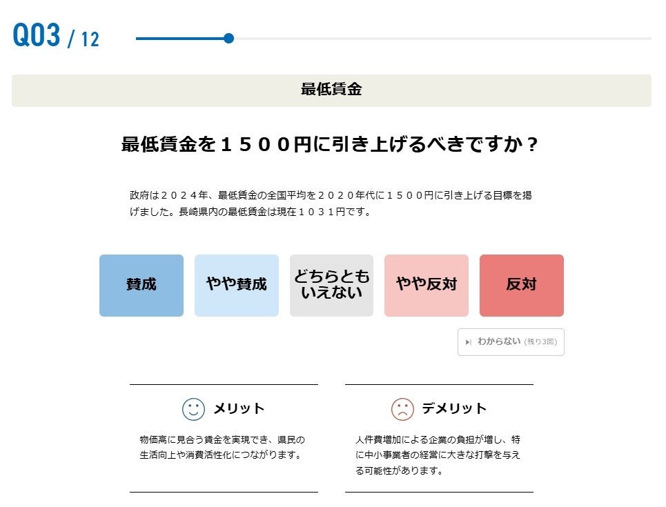 今回の知事選の「争点」として挙げられている最低賃金や外国人材の受け入れ、離島振興など幅広い分野の設問になりますが、全ての質問に概要を説明する「解説文」と「メリット」「デメリット」を記載することで、利用者の判断材料をご提供します。