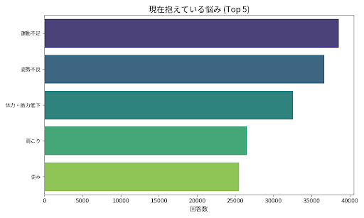 最も多い回答 「運動不足」、次いで「姿勢に関する悩み」「体力・筋力に関する不安」。 -