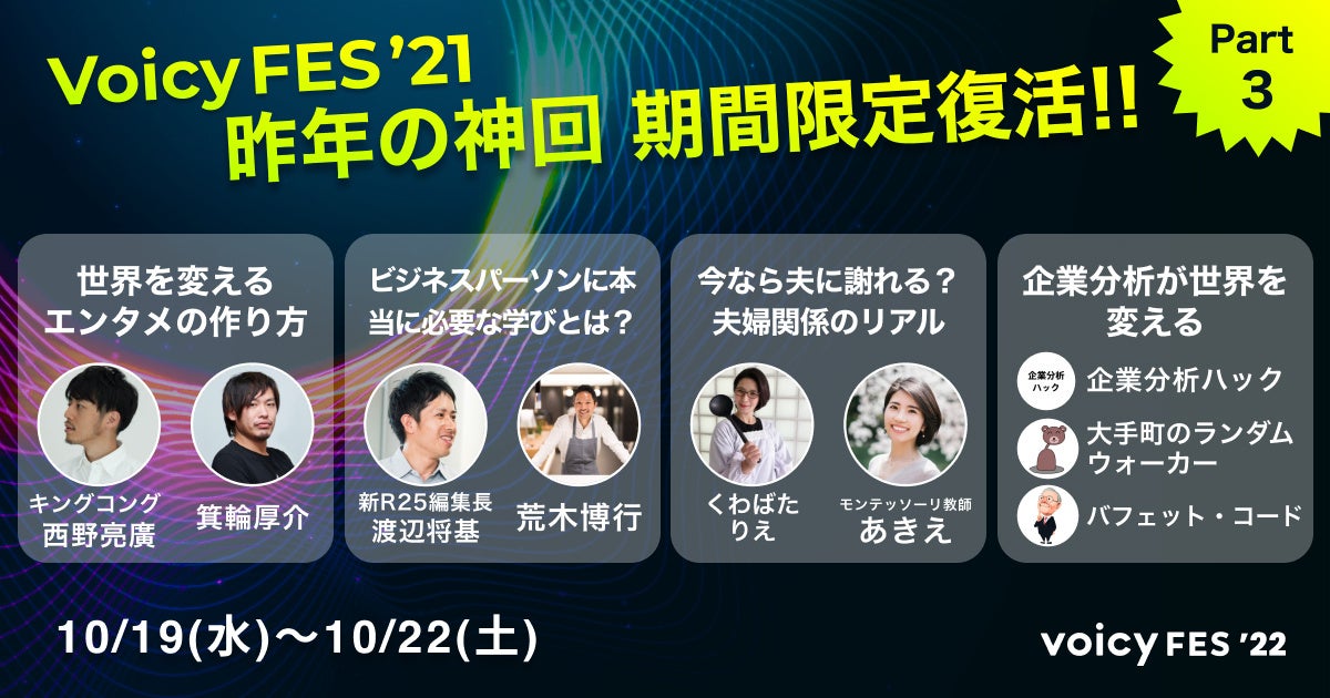 音声プラットフォームVoicyを運営する株式会社Voicyは、“世界を変える声の祭典”「Voicy FES ’22」を2022年10月27日(木)から29日(土)の3日にわたって開催します。リクエストにお応えして、昨年白熱した対談を厳選しアーカイブ放送します。Voicy FES ’22チケットをご購入いただいた方を対象に、有料放送として期間限定でお聴きいただけます。