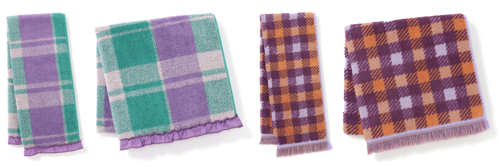 【価格】フェイスタオル:¥1,400/バスタオル:¥3,200オリジナルデザインのチェックにフリルのヘムデザインをほどこしたタオルです。裏面は全面パイルで吸水性も優れいています。抗菌防臭機能付き。