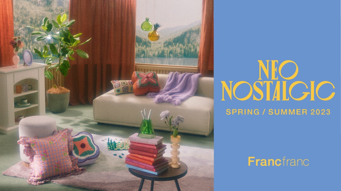 2023年Spring&Summer Collectionシーズナルコレクションのテーマは『NEO NOSTALGIC(ネオ ノスタルジック)』。忙しい日常からのがれ、精神的な脱出・開放を求めて、チルタイムが取れるお気に入りのチェアや心地よいリラックス空間へ誘ってくれるフレグランスなど、人によって様々な息抜きのスタイルがあります。お気に入りの空間でリフレッシュし、また日常への活力とする。2023年最初のシーズナルコレクションはそんなふうに人々を癒したり、外へ遊びに出る活力になる様なアイテムをラインアップしました。抑圧された状態から開放され、喜びを祝うポップなデザインをモチーフに取り入れています。明るくハッピーでどこかノスタルジックなコレクション。日常も非日常もどちらも上手に楽しんで過ごすライフスタイルを Francfranc らしい世界観で提案します。