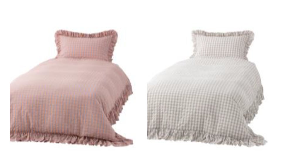 シアサッカー織りでチェックを表現したまくらカバーと掛け布団カバーです。周囲にあしらったフリルがポイントで大人かわいいベッドルームを演出します。モーティス ベッドとのコーディネートもおすすめです。