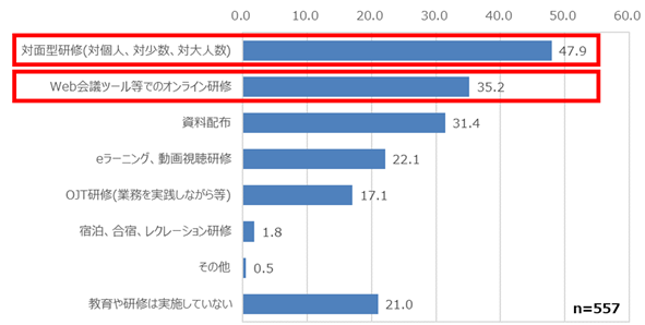 ・教育・研修の方法は、対面型研修が最も多く47.9%