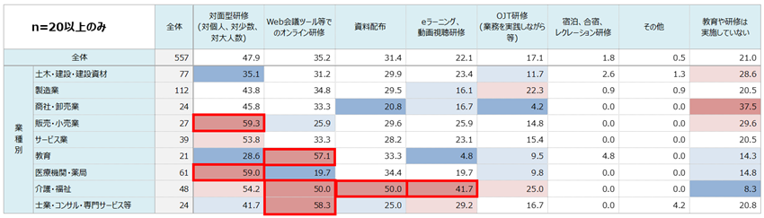 ・販売・小売業や医療機関・薬局において対面型研修が全体と比較して高い