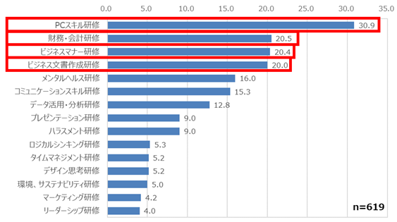 ・「ビジネス文書作成研修」が20.0%で4項目が2割を超える