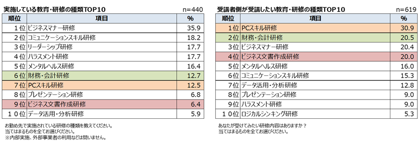 ・その他、6位である「財務・会計研修」が2位、9位である「ビジネス文書作成研修」が4位になるなど差がある