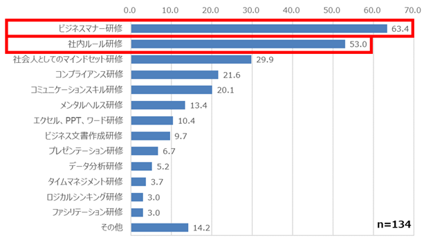 ・続いて、「社内ルール研修」が53.0%で、2項目が5割越え