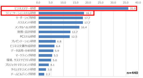 ・続いて、「コミュニケーションスキル研修」で18.2%、「リーダーシップ研修」、「ハラスメント研修」が17.7%で並ぶ