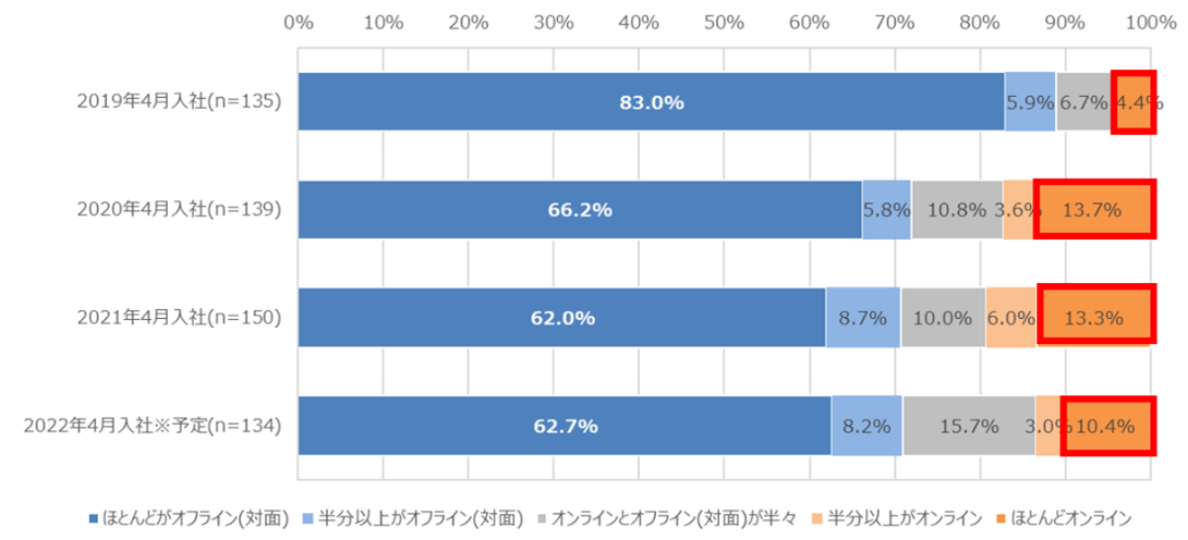 ・コロナ影響が出始めた2020年4月入社は、「ほとんどがオフライン(対面)」が6割台に低下し、「ほとんどオンライン」が増加した結果となっているが、今年の2022年4月入社に関しては、過去2年とは少し違いやや数値が低下