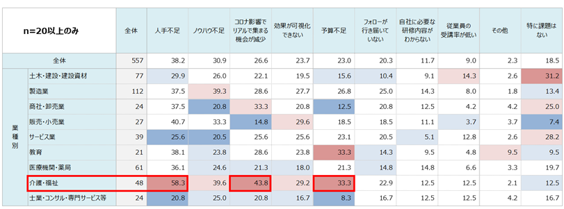 ・特に目立つのは介護・福祉で「人手不足」、「コロナ影響でリアルで集まる機会が減少」、「予算不足」が全体として比較して10pt以上高い
