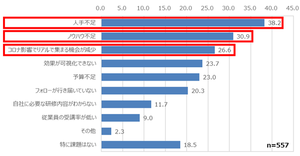 ・教育・研修の課題では、「人手不足」が最も多く38.2%