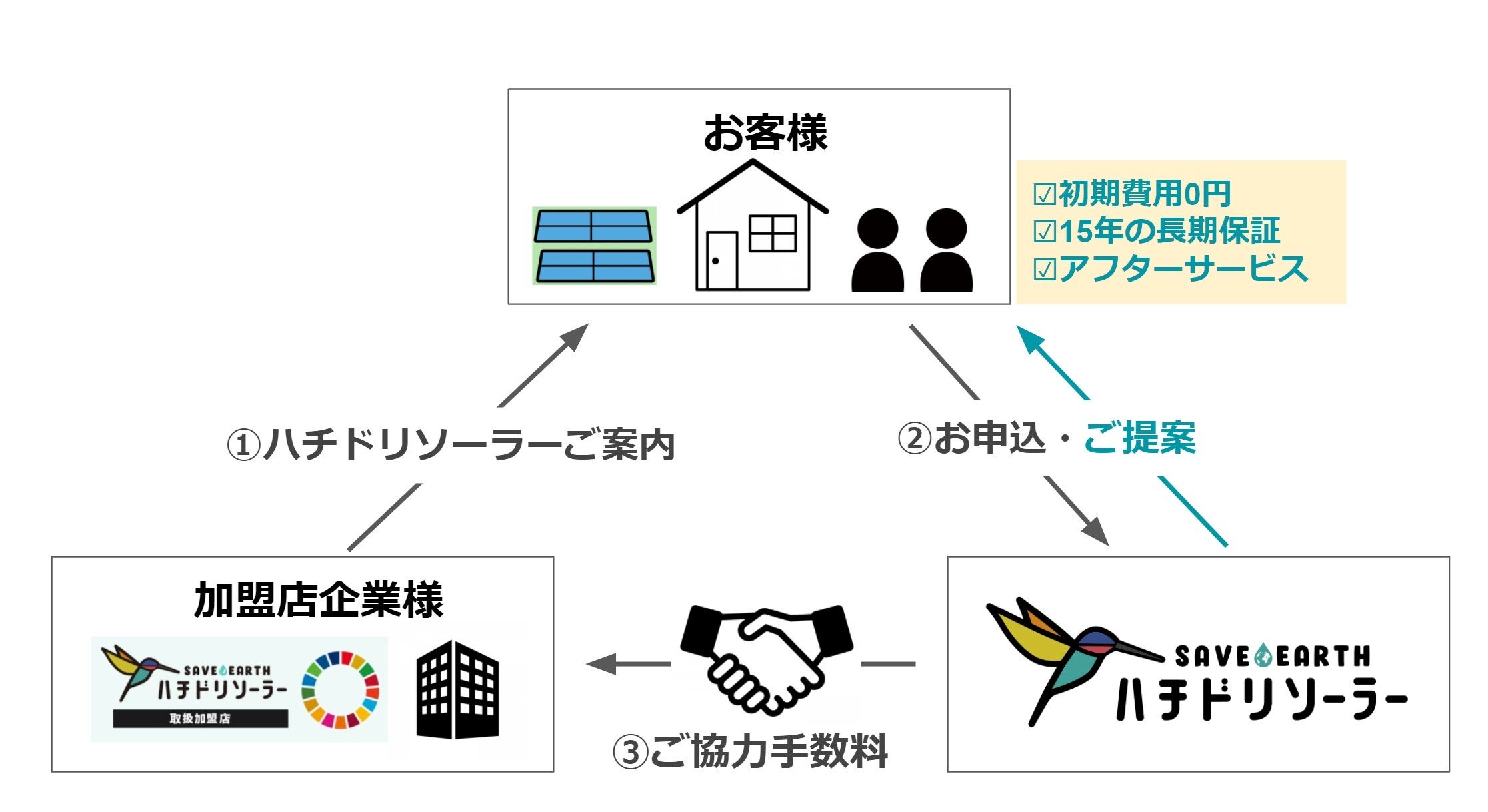 ① 加盟店企業は新築住宅やリフォームを検討するお客さまへ、初期費用0円の太陽光発電サービス「ハチドリソーラー」をご案内