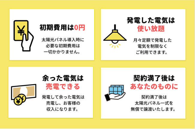 太陽光パネル導入時に必要な初期費用は一切かかりません。導入時の工事費用や太陽光パネル等の機器も、費用負担0で導入いただけます。