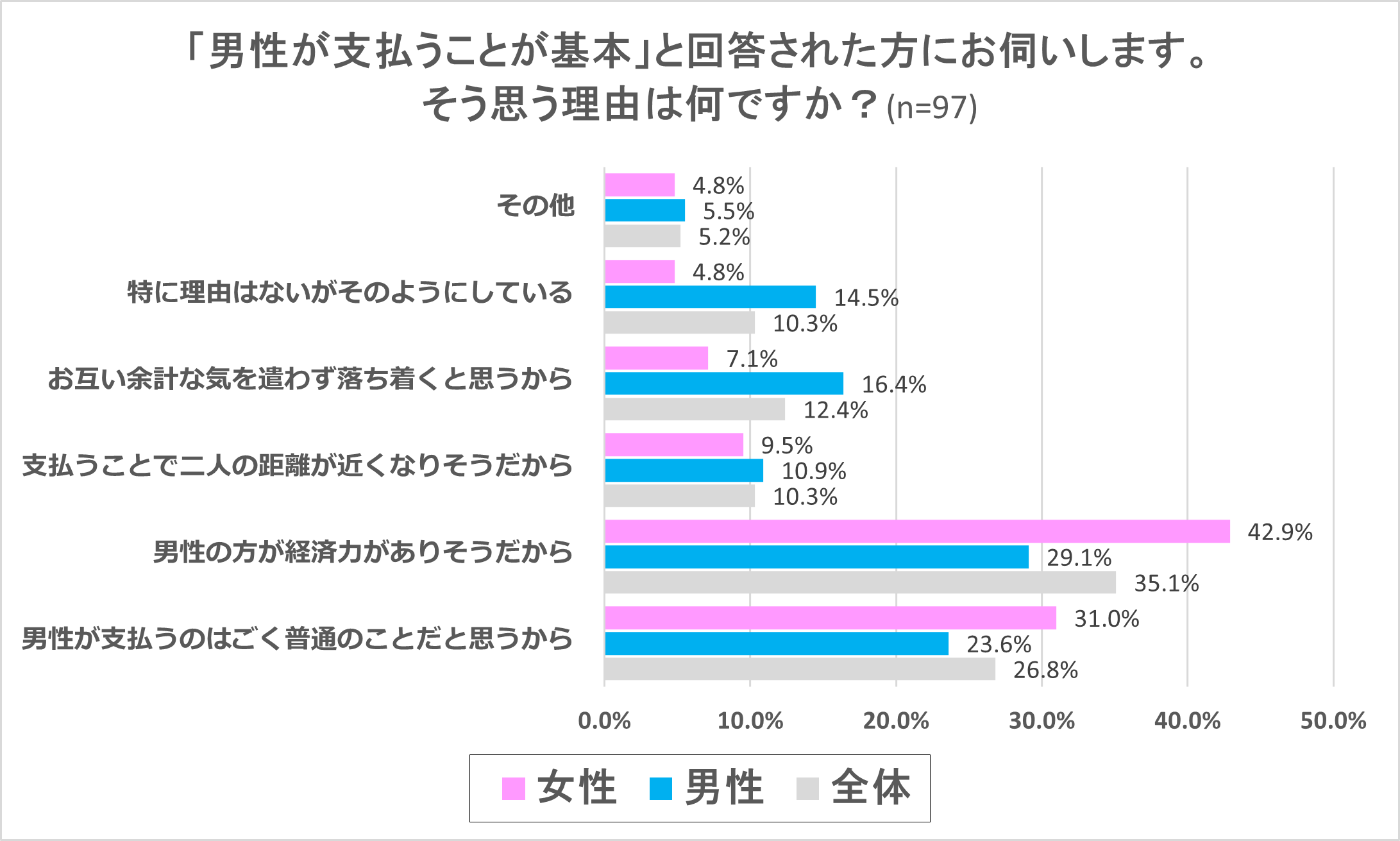 この設問では「男性が支払うことが基本」と回答した全体の約4分の1にあたる男女97人にその理由を質問いたしました。